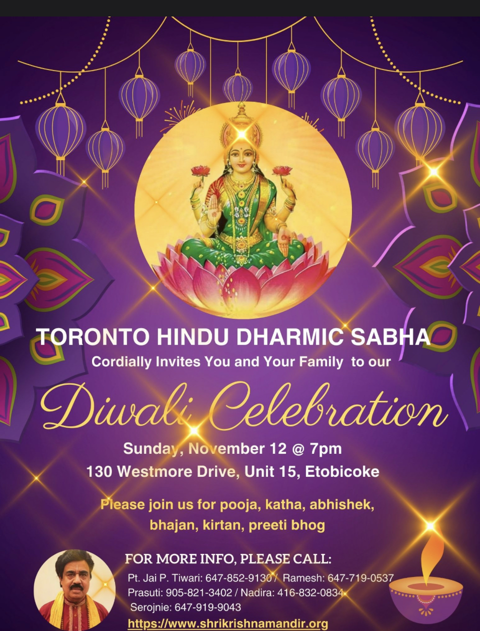 Toronto Hindu Dharmic Sabha cordially invites you and your family to our Diwali celebration on November 12 @ 7pm. Please join us for pooja, katha, abhishek, bhajan, kirtan, preeti bhog