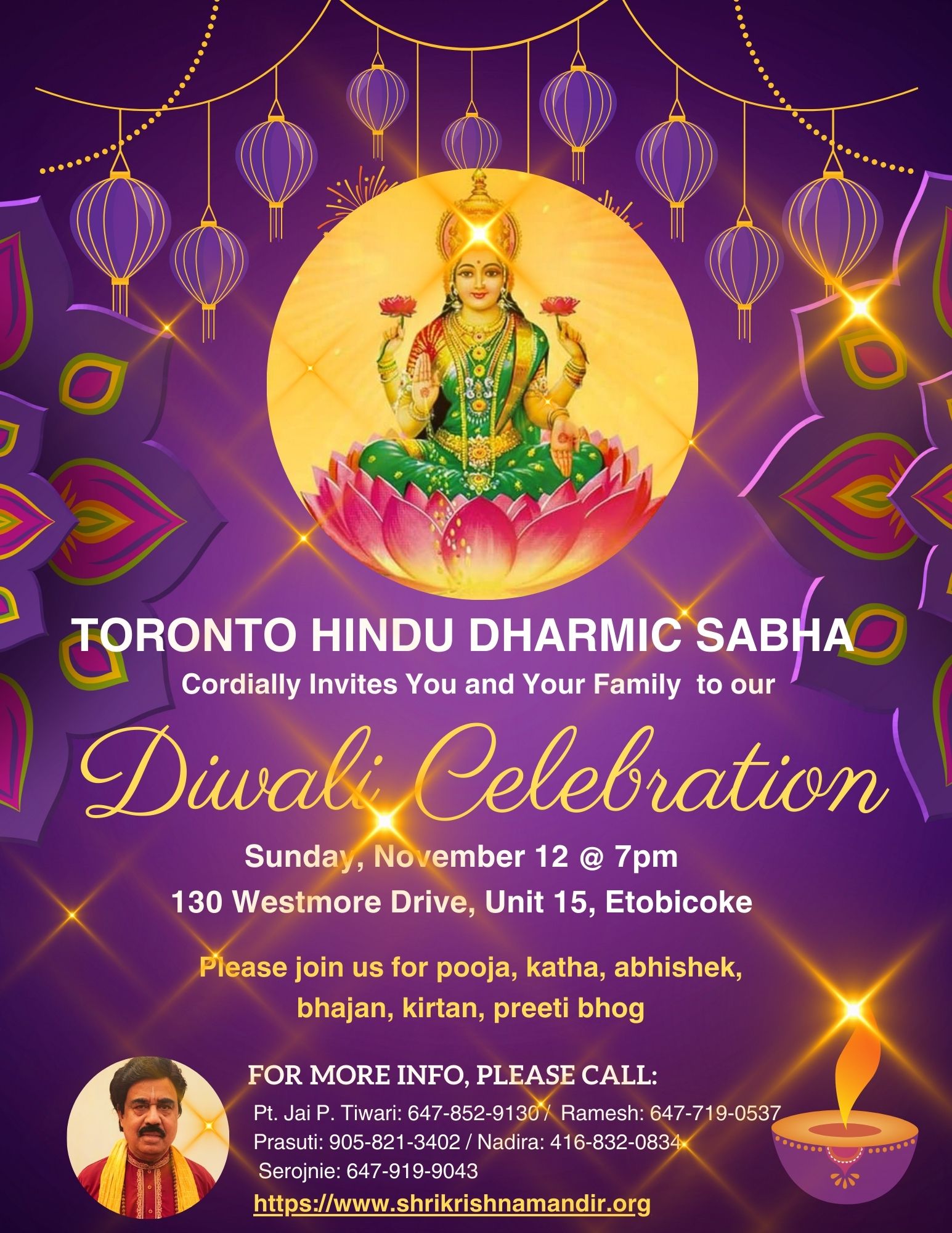 Toronto Hindu Dharmic Sabha cordially invites you and your family to our Diwali celebration on November 12 @ 7pm. Please join us for pooja, katha, abhishek, bhajan, kirtan, preeti bhog