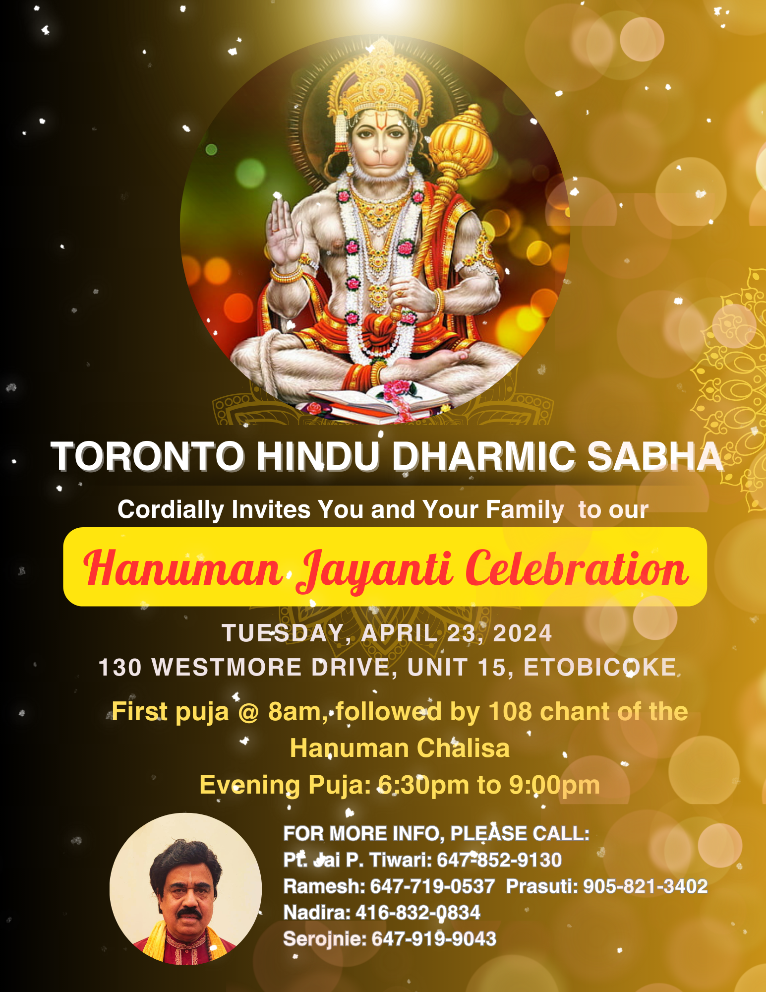 Toronto Hindu Dharmic Sabha cordially invites you and your family to our Hanuman Jayanti Celebration on Tuesday, April 23rd. First puja at 8am followed by 108 chant of the Hanuman Chalisa. Evening puja from 6:30pm to 9pm.